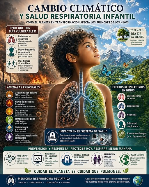 El artículo Climate Change and Pediatric Respiratory Health: An Emerging Paradigm in Prevention and Critical Care, (Pediatric Respirology and Critical Care Medicine, Ahmed A. Almohammadi, 31-Mar-2026), plantea que el cambio climático debe entenderse ya no solo como un problema ambiental, sino como un determinante mayor de salud infantil, con consecuencias directas e indirectas sobre el sistema respiratorio. Su tesis central es clara: los niños constituyen una población especialmente vulnerable frente a los riesgos respiratorios derivados del calentamiento global, debido a que sus pulmones aún están en desarrollo, tienen una frecuencia respiratoria más alta que los adultos y pasan más tiempo expuestos al ambiente exterior.
